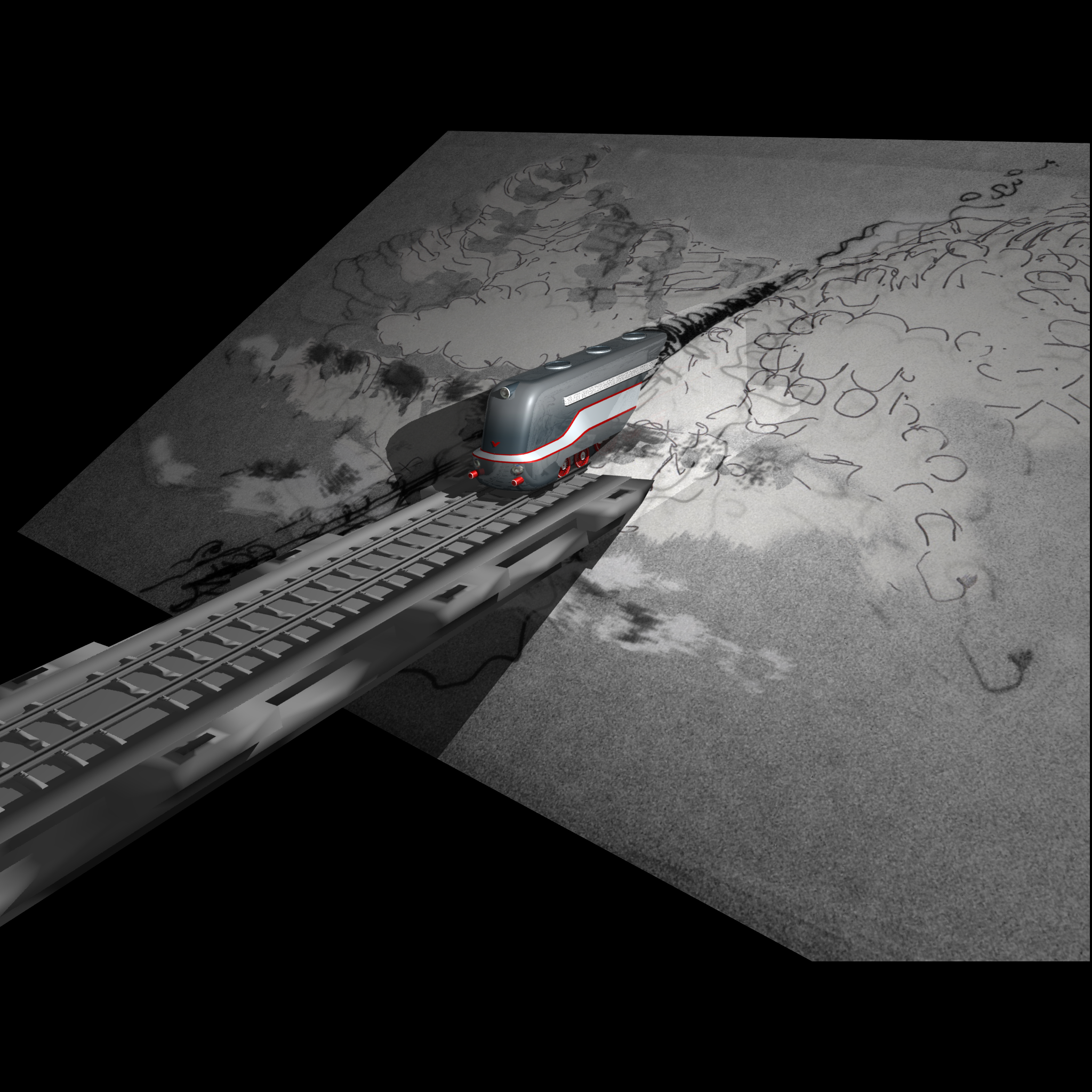 After following a ramp carved between the cliffs, the time travel train enters the water of the ocean.