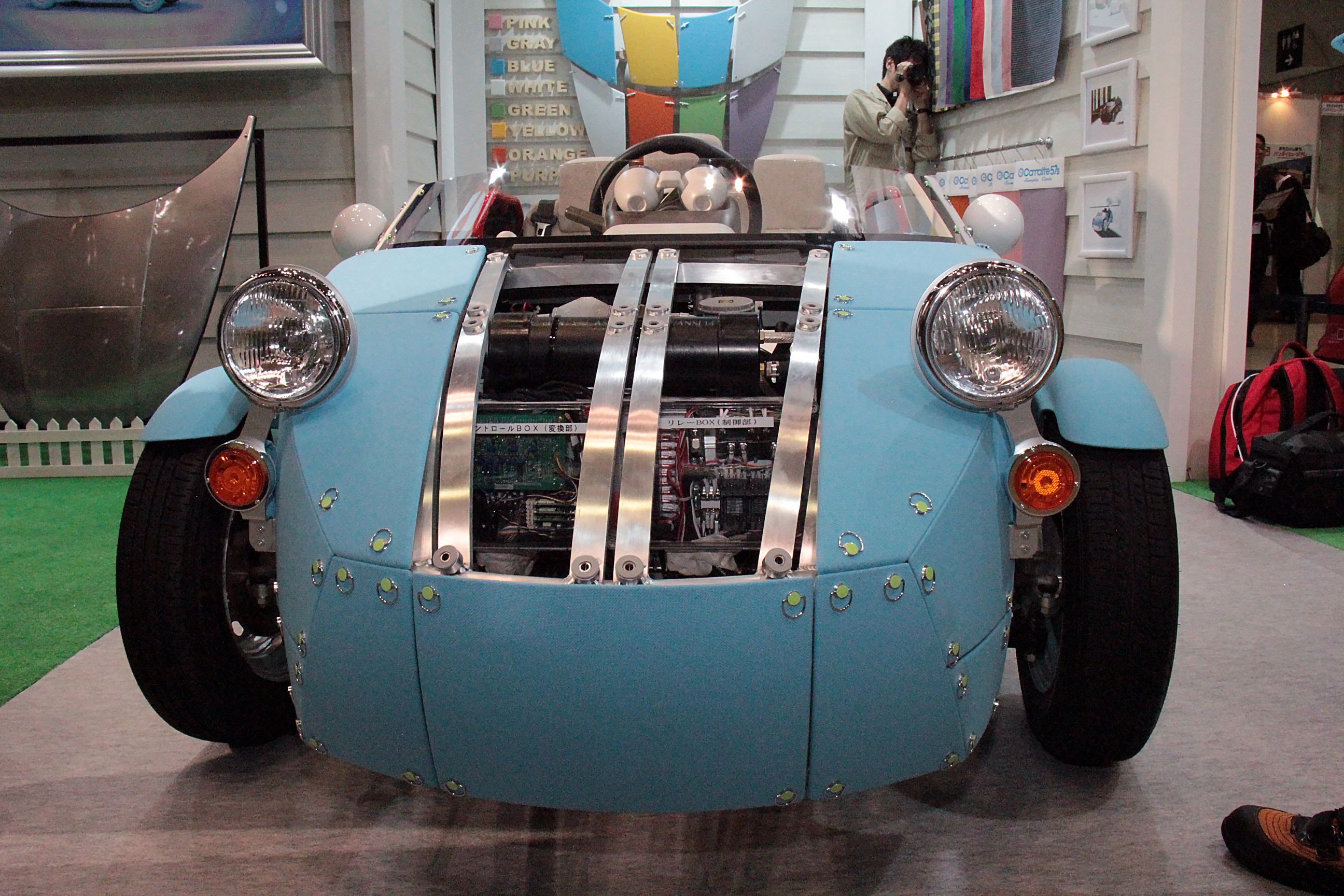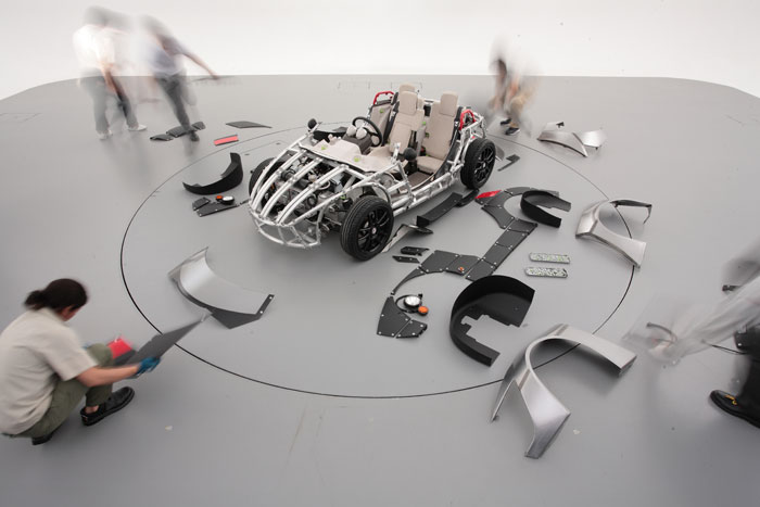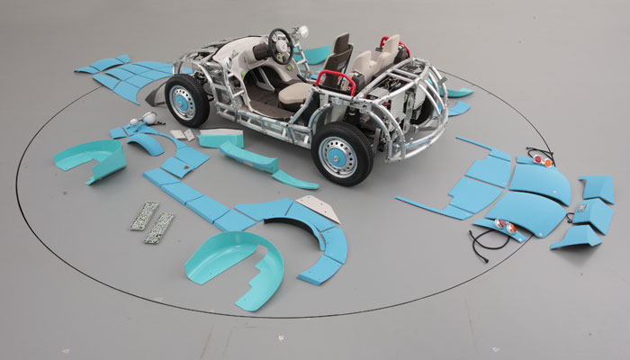 of three-dimensional tiles snapped on the frame of the car. This is a cross betwwen Ikea's furniture design and Tamaiya's toy design.