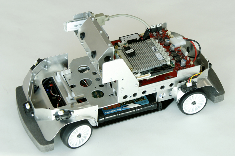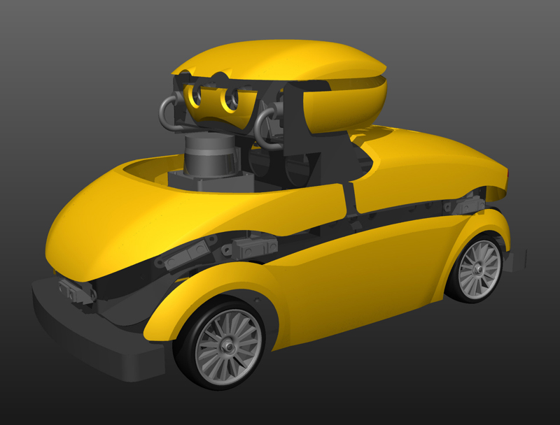Designing a car's body that can be understood by a computer vision system. The "head" of the car with a video camera and an infra red camera for the computer vision system are clearly visible on top of the car. This system can pick up images of other cars and determine their orientation in space and their direction of motion. The design of the body of the Robo Car divided into segments like the exoskeleton of an insect with black joints between the segments facilitates the work of the computer vision system.
