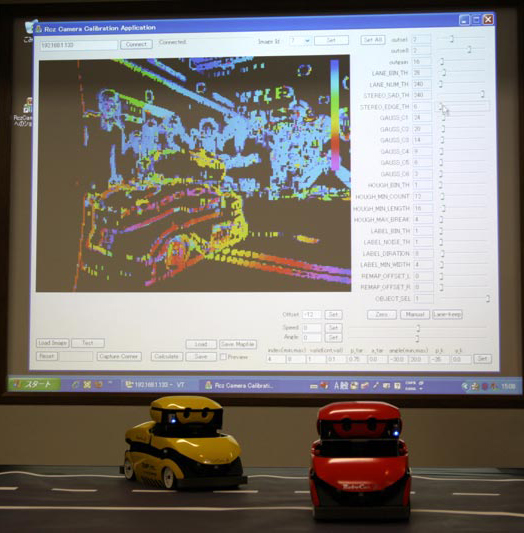 We can see that the lights of the video cameras from the yellow and red cars. The image projected behind the cars shows the computer vision system of the yellow car looking at the red car. People watching the demo are visible in blue in the background. The image of the red car rendered with dotted lines is visible on the screen. The system can also analyze the lines of the lanes painted on the floor. In this case, the design of the head on top of the body is obviously a key element of the processing of the image of the car by the computer vision system.
